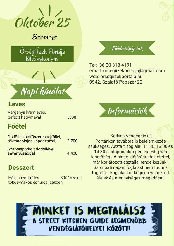 Őrségi kirándulása során, amennyiben a hagyományos éttermek kínálatán túlmenően szeretne megismerkedni a tájegységre jellemző autentikus házias ételekkel, akkor szeretettel invitálom a falusi hangulatot idéző Őrségi Ízek Portája - Lakáséttermünkbe. Ismerje meg az őrségi dödöllét, a tejfölös hajdinás vargányalevest, a borsús ( babos ) káposztát, a vasipaprikás-szeletet, a búza-kukorica-illetve hajdinamálét, a tökös-mákos vagy a kerekrépás rétest. Lakáséttermünk ideális helyszín mindazoknak,akik vágynak a régi tájjellegű házias ízek megismerésére, de nem a megszokott éttermi körülmények között, hanem kötetlenebb, közvetlenebb környezetben szeretnének asztalhoz ülni.