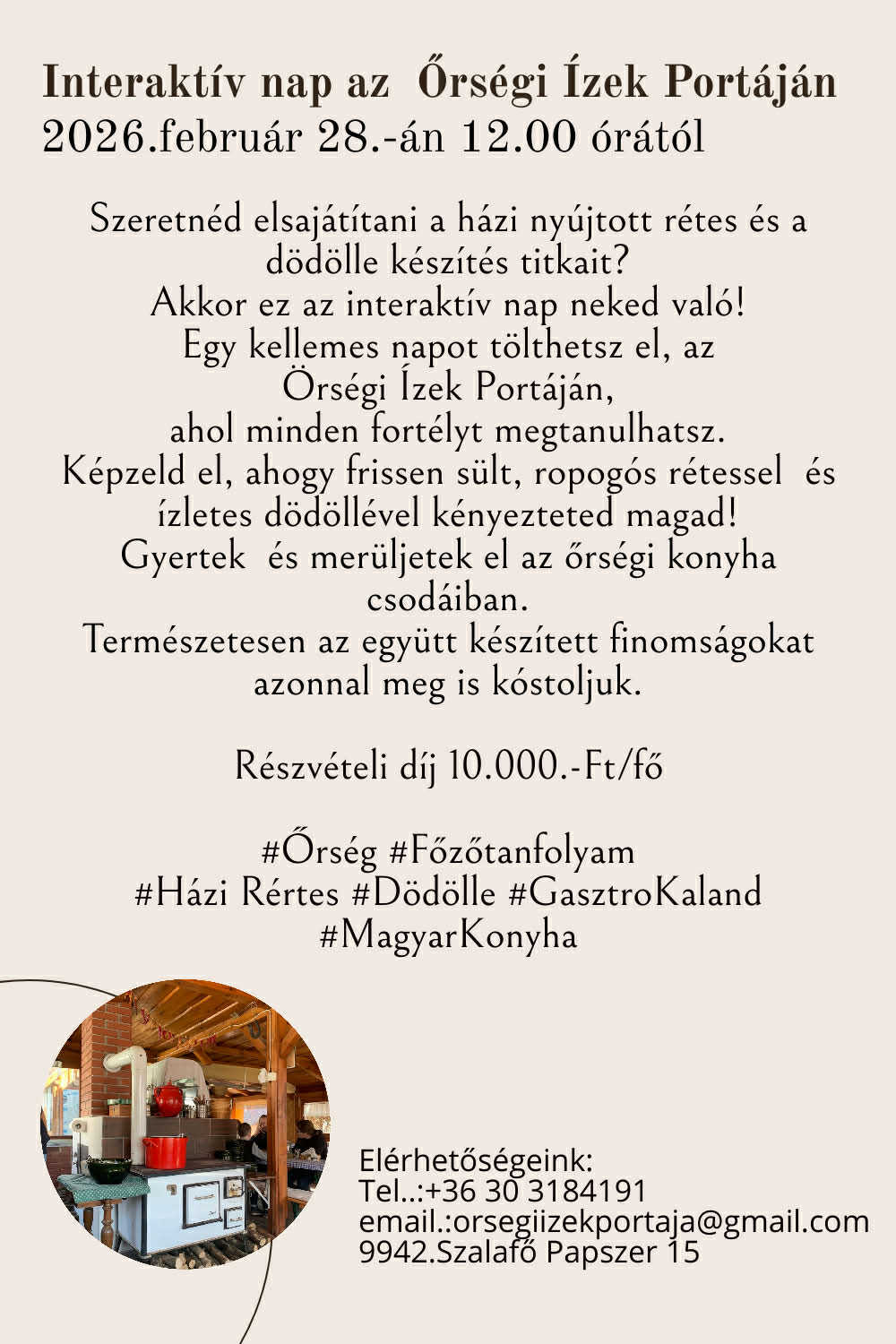 Szeretnél elsajátítani a házi nyújtott rétes és a dödölle titkait? 😋 Akkor ez a főzőtanfolyam neked való! Egy élménydús napot tölthetsz el az Őrségi Ízek Portáján, ahol minden fortélyt megtanulhatsz. ✨ Képzeld el, ahogy frissen sült, ropogós rétessel és ízletes dödöllével kényezteted magad! 🏡 Gyertek el, és merüljetek el az őrségi konyha csodáiban! Természetesen az elkészült finomságokat együtt meg is kóstoljuk! 🍽️